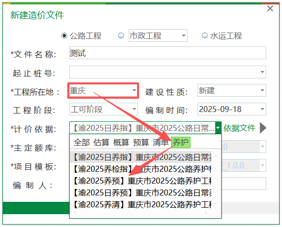 打开软件“新建工程”界面,新建造价文件选择重庆-【渝2025养预】【渝2025日养预】等使用;