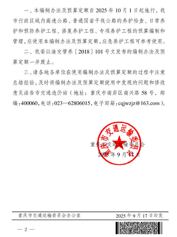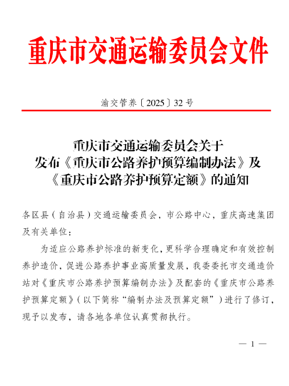 自2025年10月1日起,重庆市正式实施《重庆市公路养护预算编制办法》及《重庆市公路养护预算定额》,适用于全市行政区域内高速公路、普通国省干线公路相关养护的预算编制与管理,应急养护工程可参考使用。