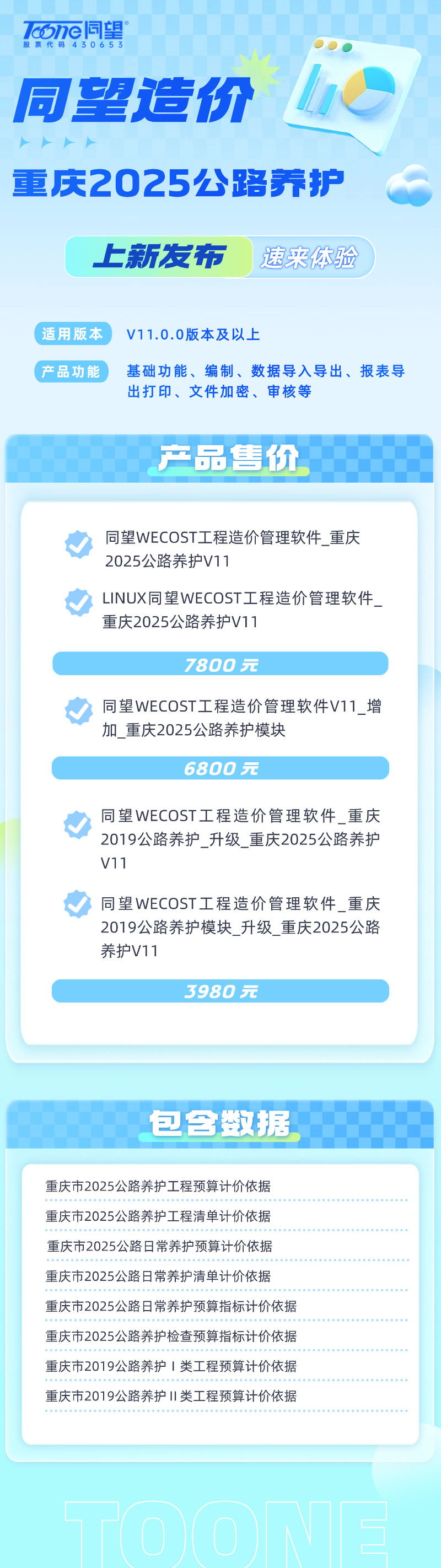 同望造价软件及时响应政策变化,结合《重庆市公路养护预算编制办法》、《重庆市公路养护预算定额》最新数据,在同望造价软件中上线重庆2025公路养护模块。