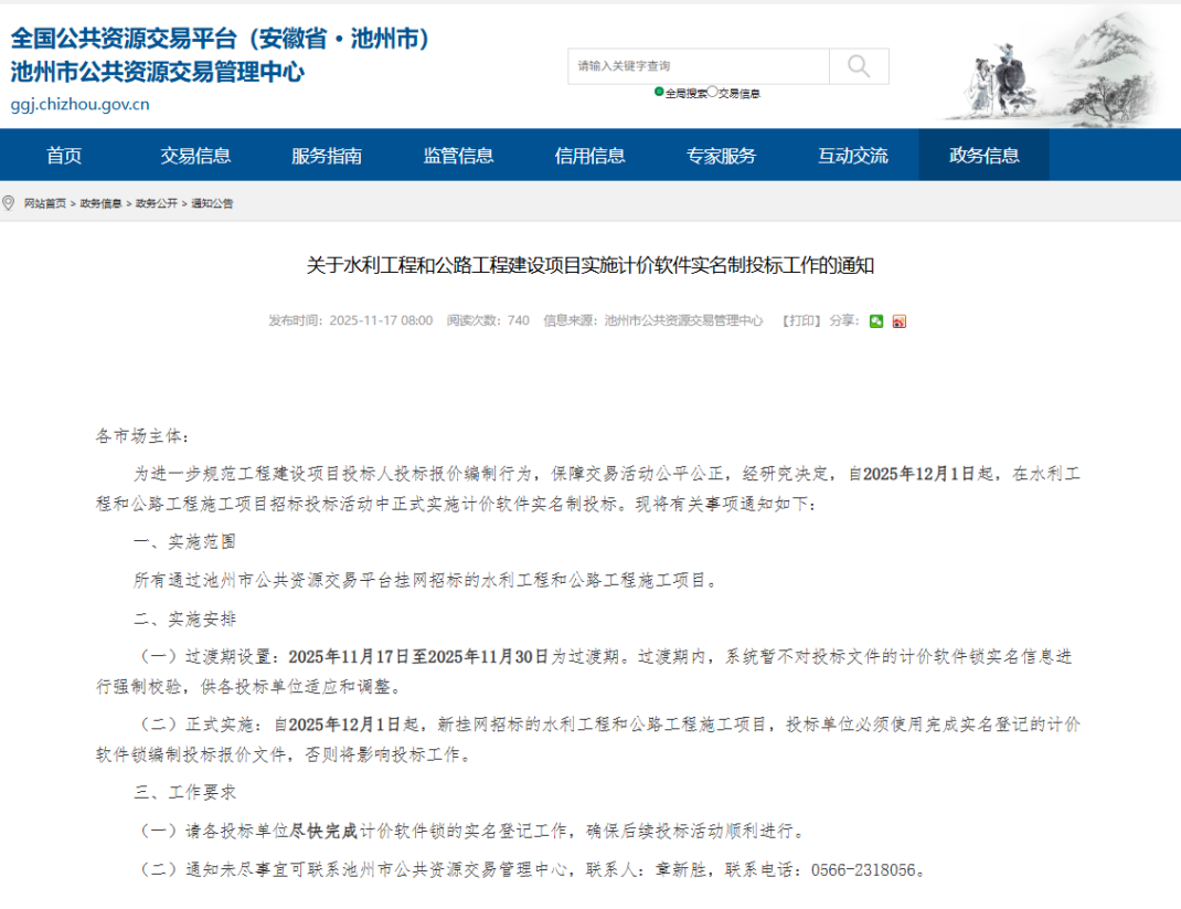 近日,据池州市公共资源交易管理中心公告,同望工程造价管理软件V11成功通过池州公路工程电子标接口实名制联测。自2025年12月1日起,当地所有通过公共资源交易平台挂网招标的公路工程施工项目,正式实施计价软件实名制投标,以此规范投标人投标报价编制行为,保障公路工程交易活动公平公正。