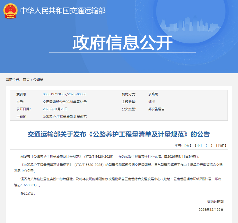 为规范和指导公路养护工程量清单编制及计量活动,统一全国公路养护工程量清单编制及计量规则,提升公路养护管理水平,促进公路养护工程量清单标准化、规范化、数字化和信息化,交通运输部发布《公路养护工程量清单及计量规范》(JTG/T5620-2025),并于2026年5月1日正式施行。