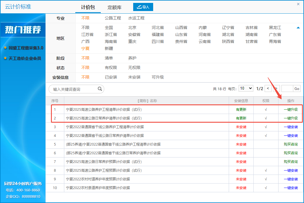 1、登录软件,在【云服务/云计价标准】中点击【一键升级】,对养护计价包进行升级;