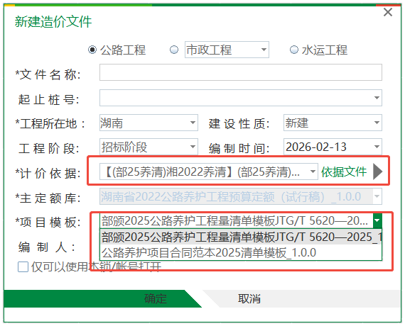 2、新建文件时,选择对应的清单计价依据,即可在项目模板中使用含《部颁2025公路养护工程量清单模板JTG/T5620—2025》、《公路养护项目合同范本2025清单模板》在内的所有清单模板。
